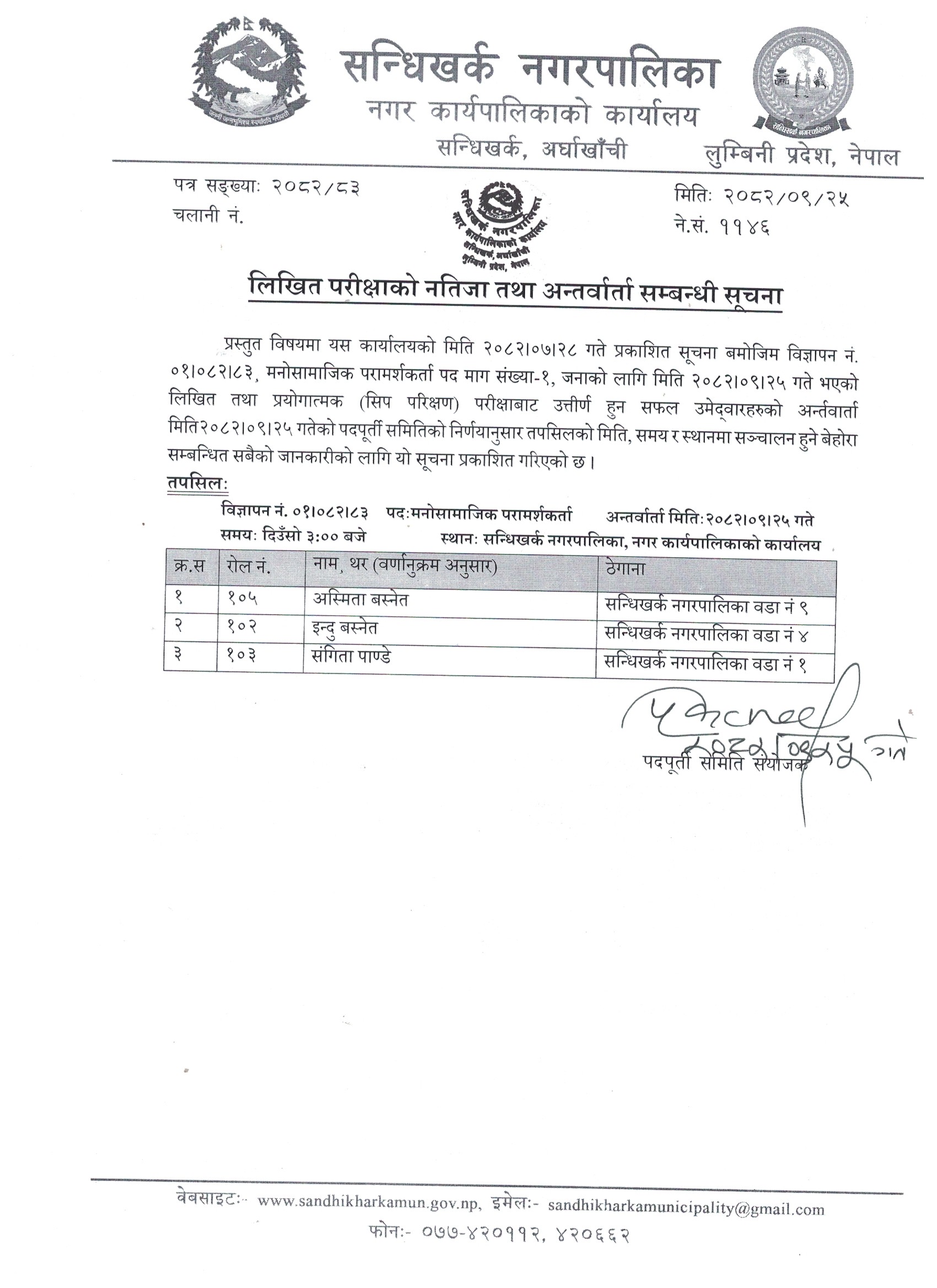 लिखित परीक्षाको नतिजा तथा अन्तर्वार्ता सम्बन्धी सूचना ।
