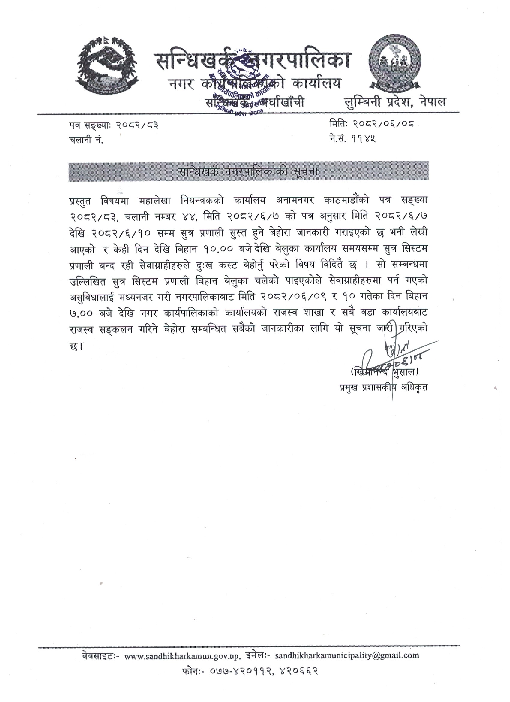info@sandhikharkamun.gov.np, sandhikharkamunicipality@gmail.com