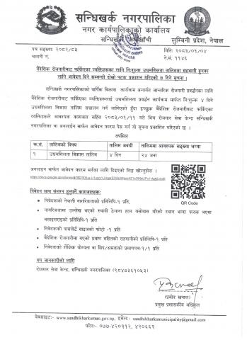 वैदेशिक रोजगारीबाट फर्किएका व्यक्तिहरुका लागि नि:शुल्क उद्यमशिलता तालिममा सहभागी हुनका लागि आवेदन दिने सम्बन्धी दोस्रो पटक प्रकाशन गरिएको ७ दिने सूचना।