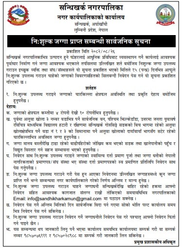 निशुल्क जग्गा प्राप्ति सम्बन्धी सार्वजनिक सूचना ।