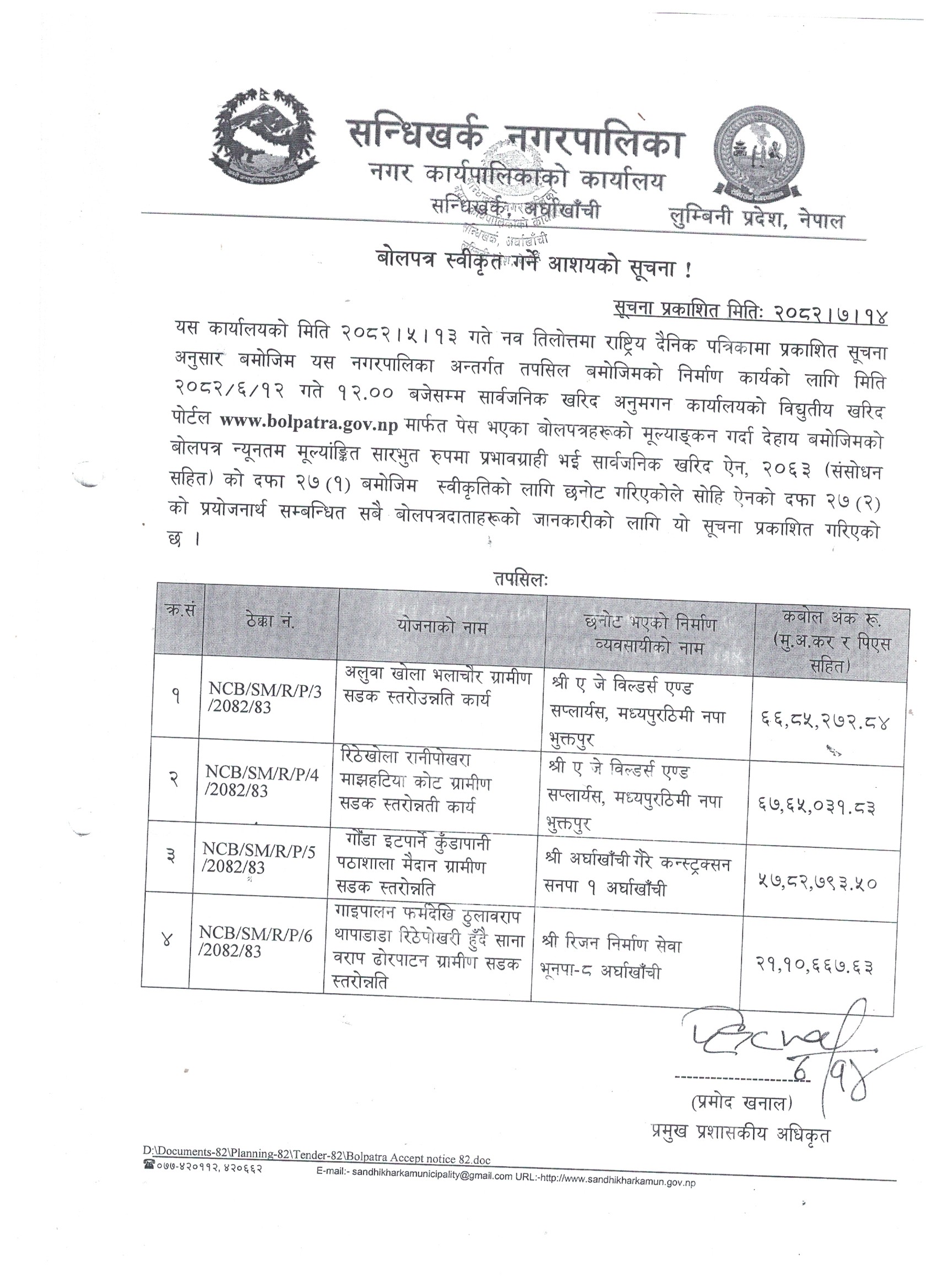 » बोलपत्र स्वीकृत गर्ने आशयको सूचना ।